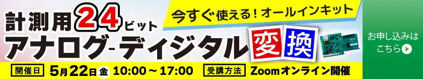 | [Webinar]今すぐ使える!計測用24bitアナログ-ディジタル変換オールインキット 5月22日開催:$\Sigma \Delta$型A-Dコンバータとセンサで,マイクロボルトを高解像度サンプリング&データ解析 |