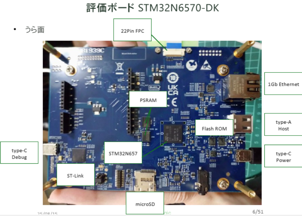 STM32N6570-DKは,STM32N657X0H3Qを搭載した評価ボードです.CPUは 800MHz Cortex-M55,メモリは4.2MB SRAMを備えています.周辺回路も充実しており,USB2.0 HS,1Gb Ethernet,5インチLCD,MEMSマイク,PSRAM,ST-Linkデバッガが実装されています.AI推論からネットワーク通信,GUI表示まで一台で実験可能です.
