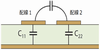 並走2線間の容量と基板の厚み 相互キャパシタンスの減少は,容量性クロストークの低減に直結する.容量性クロストークは$C_{12}$に比例するため,基板厚を小さくすることで信号干渉を抑制できる |