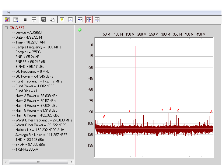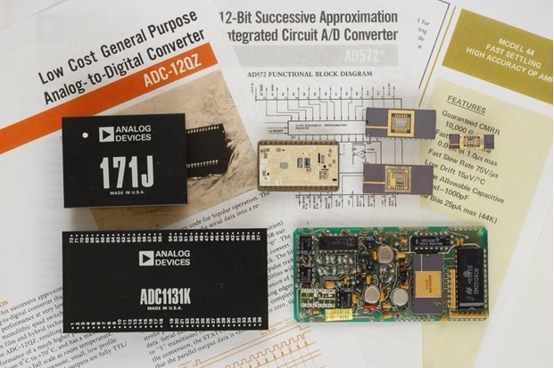図1 AD9680 14ビット 1.25GSPS 高速ADコンバータのFFTスペクトラム 写真1 モジュールからモノリシックICまで、コンバータの半世紀の進歩