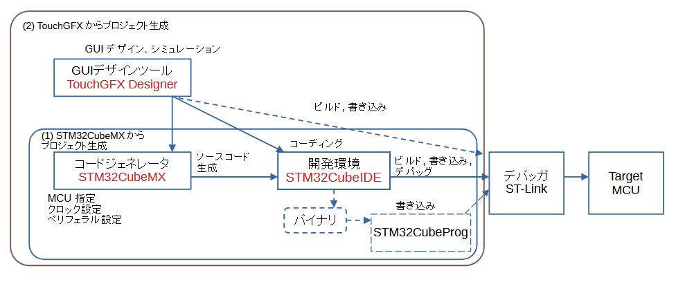 図2に示すのは,STM32H747I-DISCOの開発フローです.赤字はツールの名前です.