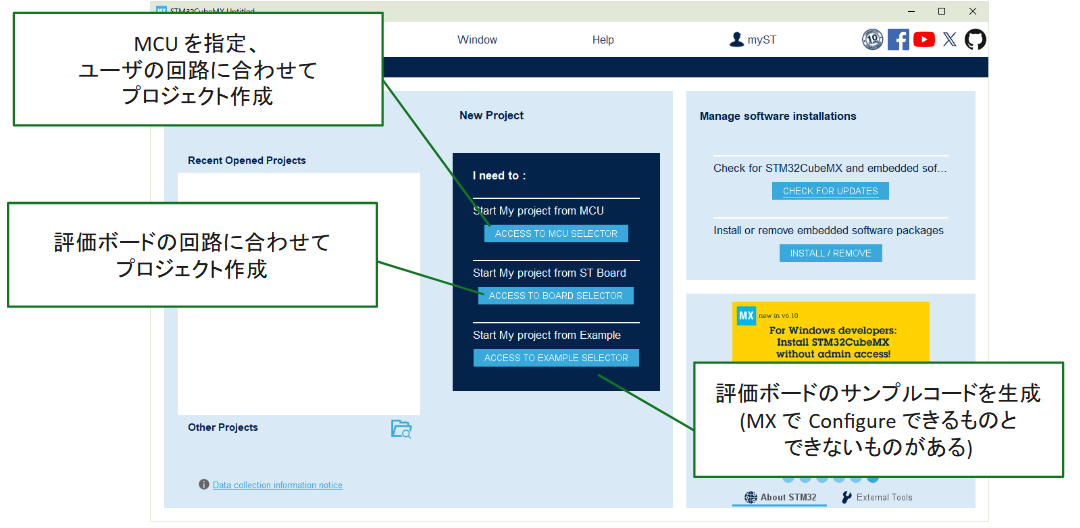 STM32CubeMXを起動すると,ホーム画面が表示されます(図3).