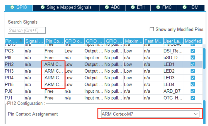図5 操作したいGPIOのPin ContextをCortex-M7に指定する