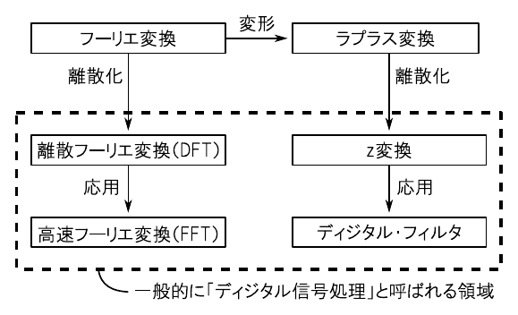 周波数解析は,「フーリエ解析」(Fourier analysis)という数学の分野によって裏付けられています.ディジタル信号処理(周波数解析)を意識してフーリエ解析の全体像を眺めると,図1のようになります.