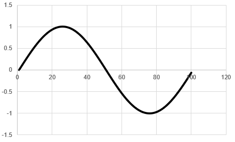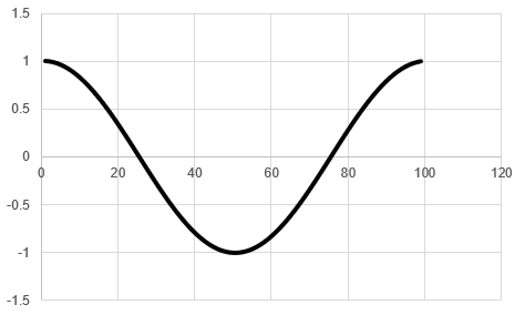 また,$\cos(\theta)$のグラフも点Pの$x$座標の軌跡として同様にイメージすることができます.今後は,$\sin$と$\cos$のグラフを合わせ「正弦波」(sine wave)と呼ぶことにします.