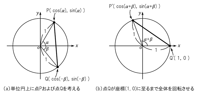 図11(a)のように,単位円上に点Pと点Qをとります.それぞれの点を$x$軸から見た角度を“$\alpha$”および“$\beta$”とします.このとき,弦PQの長さの2乗は「三平方の定理」より次のように求められます. \begin{align} \label{eq:PQ_1} |\mathrm{PQ}|^2 &= \left\{ \cos(\alpha) – \cos(-\beta) \right\}^2 + \left\{ \sin(\alpha) – \sin(-\beta) \right\}^2 \nonumber \\ &= \left\{ \cos^2(\alpha)- 2\cdot \cos(\alpha) \cdot \cos(\beta) + \cos^2(\beta) \right\} \nonumber \\ &+ \left\{ \sin^2(\alpha) + 2\cdot \sin(\alpha) \cdot \sin(\beta) + \sin^2(\beta) \right\} \nonumber \\ &= 2 – 2 \cdot \left\{ \cos(\alpha)\cdot \cos(\beta) – \sin(\alpha) \cdot \sin(\beta) \right\} \end{align}