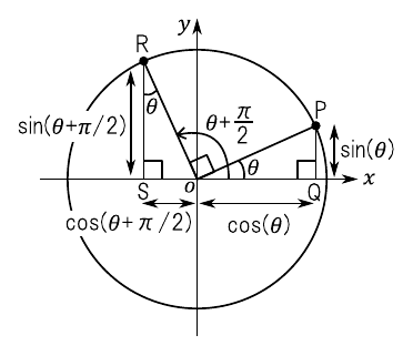 図12のように,単位円上に点Pと点Rをとります.$\mathrm{\Delta OPQ}$と $\mathrm{\Delta ROS}$は合同なので,$\sin$および$\cos$の定義から次の2式が得られます. \begin{align} \label{eq:sin_pi_2} \sin(\theta) &= – \cos \left( \theta + \cfrac{\pi}{2} \right) \\ \label{eq:cos_pi_2} \cos(\theta) &= \sin \left( \theta + \cfrac{\pi}{2} \right) \end{align}