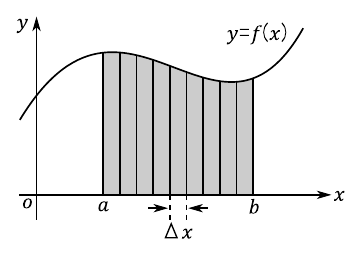 図16の色付き部分は,“$a \leqq x \leqq b$”の範囲で関数$f(x)$のグラフと$x$軸で囲まれた領域を表しています.ここでは,この領域の面積を求めることを考えます.関数$f(x)$は曲線なので,そのままでは簡単に面積を求めることができません.