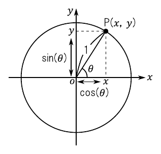 図4のように半径が“1”の円を考えます.このような円を「単位円」(unit circle)といいます.単位円の円周上にある点“$\mathrm{P}(x,y)$”を考え,$x$軸から点Pを見た角度を“$\theta$”とします.この点Pの$x$座標を“$\cos (\theta)$”,$y$座標を“$\sin (\theta)$”と定義します. \begin{align} x &= \cos(\theta)\\ y &= \sin(\theta) \end{align}
