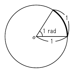 これに対して,「ラジアン」は「円周の長さ」に着目して定められた角度の単位です.単位円上の弧の長さが“1”になるときの中心角を“1 rad”として定義します(図5).