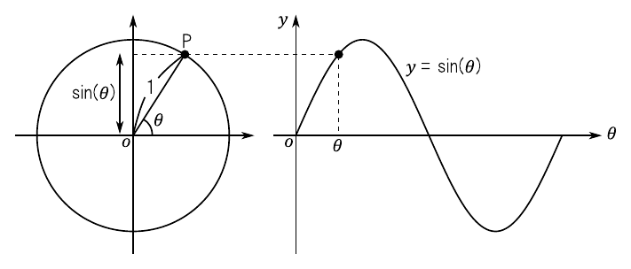 “$\sin(\theta)$”とは,単位円上を動く点Pの「$y$座標」の値でした.図6のように角度“$\theta$”を変化させたときにPが動く軌跡をイメージすれば,$\sin(\theta)$のグラフを描くことができます.