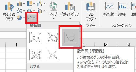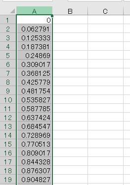 Excelを起動し,一番左上のセル(A1セル)を選択した状態でキーボードから[Ctrl] + [v]を入力します.先ほどコピーしたデータが貼り付けられたことを確認したら,続いてA列全体を選択します(図8.この状態で画面上部のメニュー・バーの[挿入]タブを選択し,「散布図(平滑線)」をクリックします(図9.図10のように1周期分の$\sin(\theta)$のグラフが表示されれば成功です. これ以降,グラフを描く時はこれと同様の手順で行うものとします.