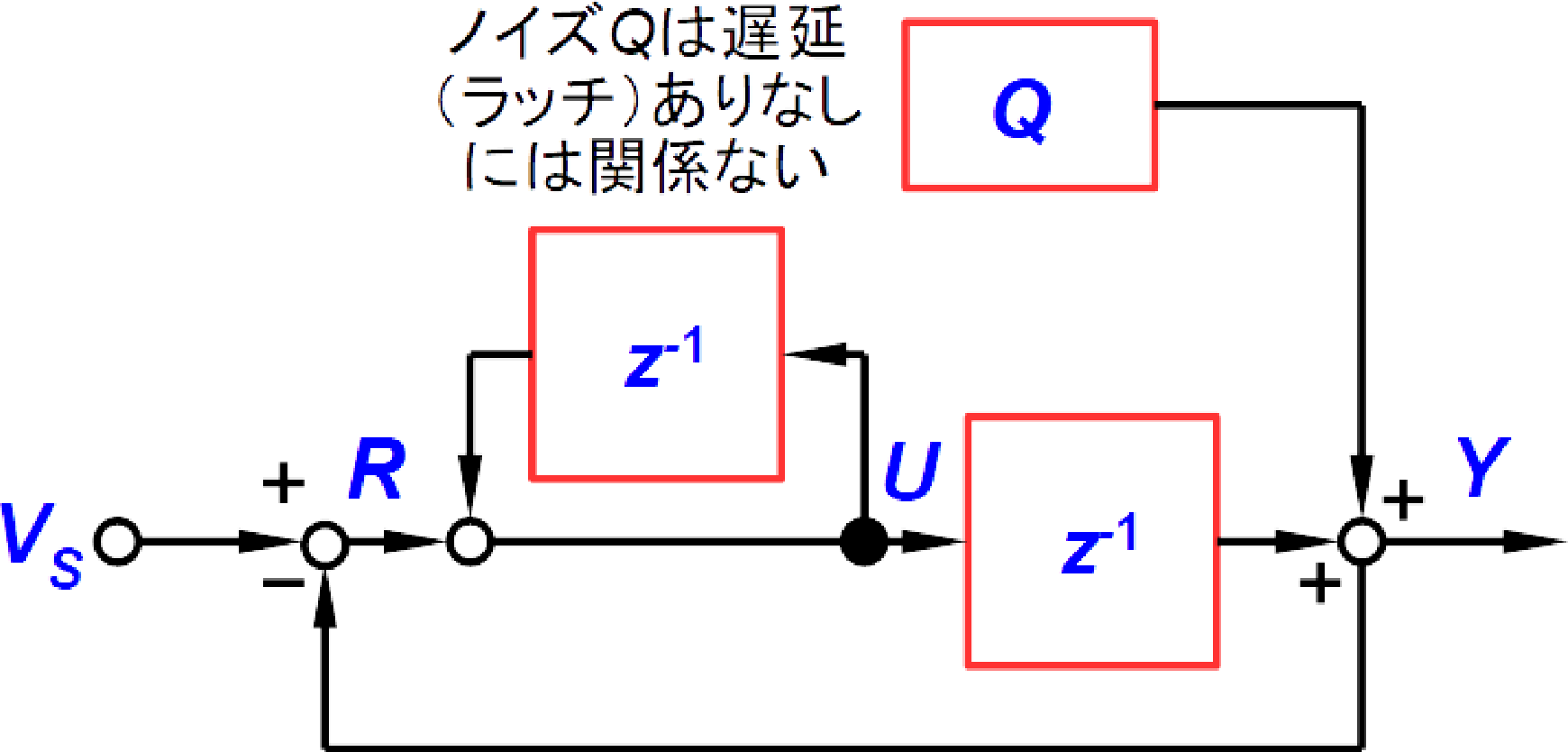 量子化ノイズ$Q$は単なる誤差量ですから,量子化ノイズ$Q$が足しあわされるようすは,後段にラッチを配置してもしなくても同じです(加わるノイズのタイミングが1サンプルずれるだけ).そうすれば図9は,図10のように$Q$のラッチを省略できます.