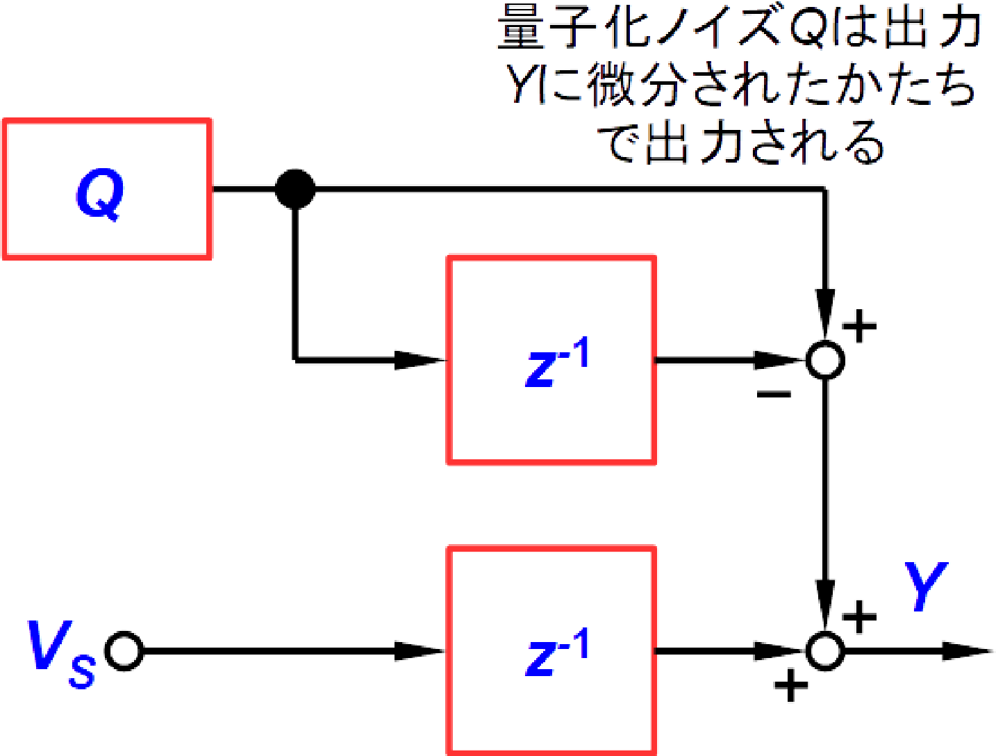 いっぽう量子化ノイズ$Q$と出力$Y$との関係(量子化ノイズ伝達関数$H_Q$)は式(7)で表されます.