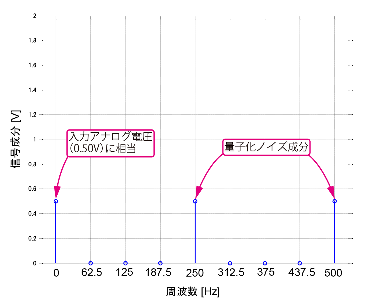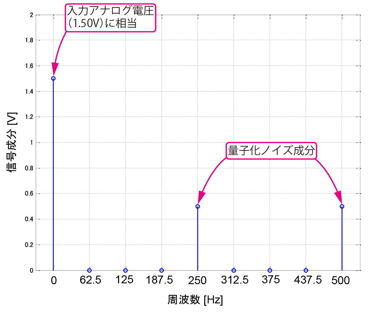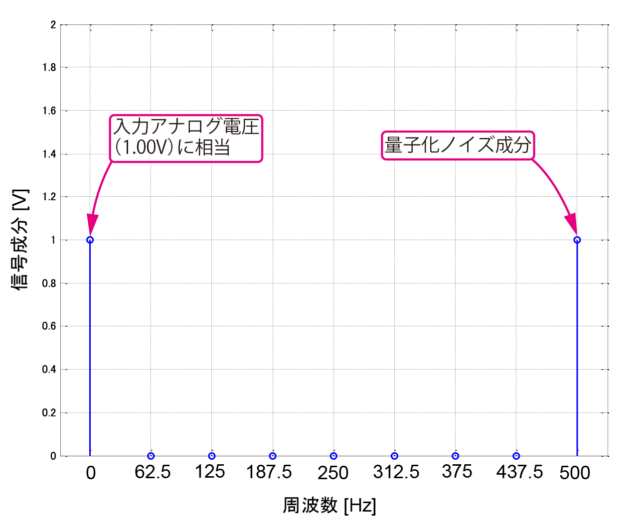 入力アナログ電圧は直流であり,同図の直流のところにその電圧成分が得られています.直流以外の周波数のスペクトルは「量子化ノイズ成分」だと考えられます.高い周波数側に量子化ノイズ成分が押しやられているようにも見えます(16ポイントFFTした結果は折り返し部分の9ポイント目,500 Hzまで表示させている).