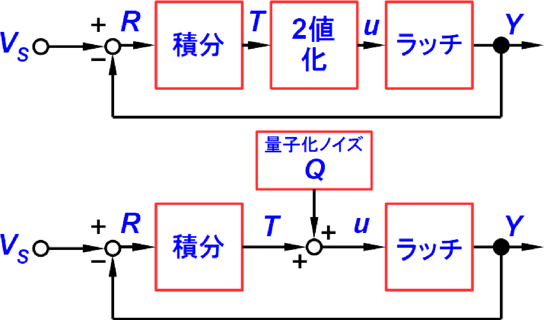 この関係から,ラッチに加わる電圧$u$(2値化された電圧)は,$T$に対して量子化ノイズ$Q$が足しあわされたものとして,同図下のように表すことができます.ラッチ出力$Y$(後段のディジタルLPFに送られるもの)は2値化された電圧であり,ディジタル論理のH/Lの1ビット・データに相当します.