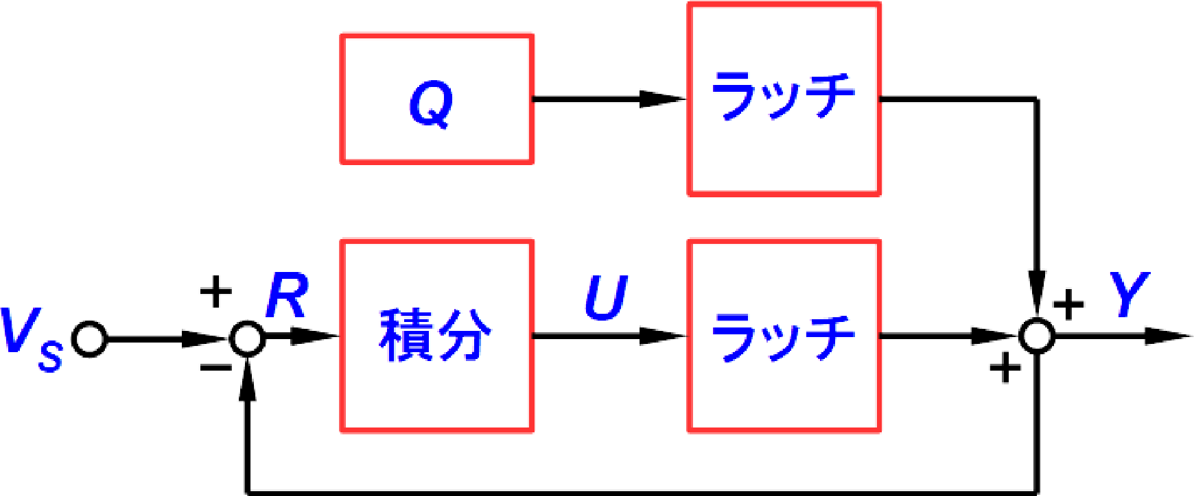 図11のブロック線図全体を数式で表してみましょう.$V_S$, $R$, $U$, $Y$, $Q$の関係は式(3)で表されます.