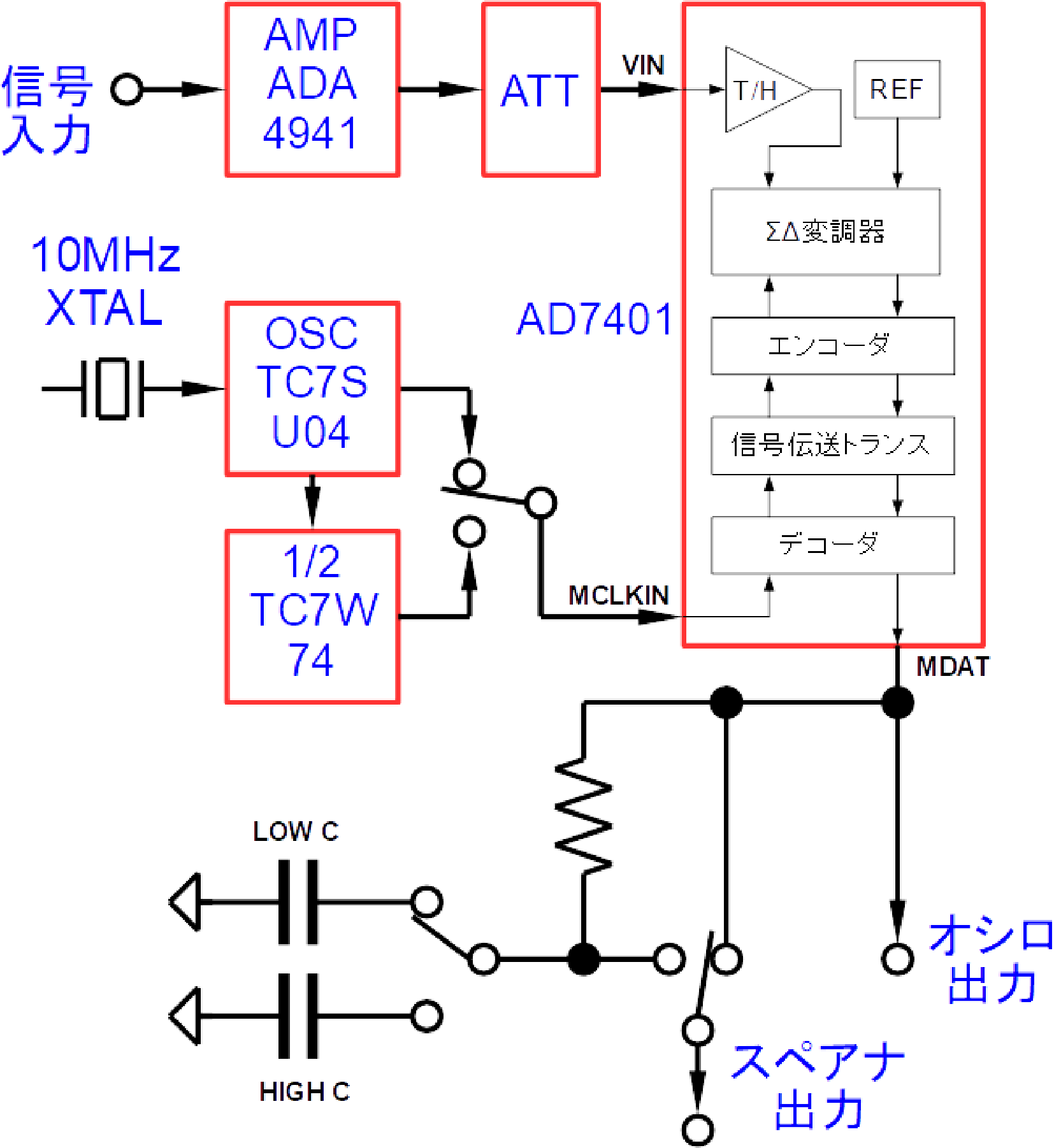 図1は,私が製作した絶縁型$\Sigma\Delta$変調器AD7401(アナログ・デバイセズ製)によるノイズ・シェーピング特性を観測できる基板のブロック図です.AD7401自体の内部ブロックも示しています.