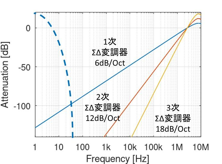 図10に,$\Sigma\Delta$変調器の次数ごとのノイズ・シェーピングの特性を示します.