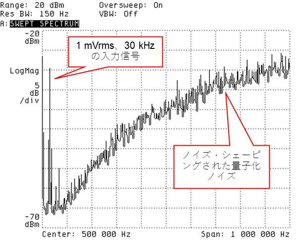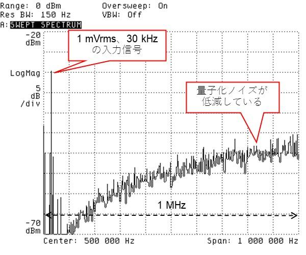 観測帯域は1 MHzです.さきのオシロスコープによる時間軸波形では,何ら情報をもっていないように見えましたが,スペクトラムを観測してみると,加えた交流電圧の成分が30 kHzのところに立っており,また量子化ノイズが高域周波数に押しやられ,整形つまりノイズ・シェーピングされていることがわかります.「なるほど,納得」ですね.