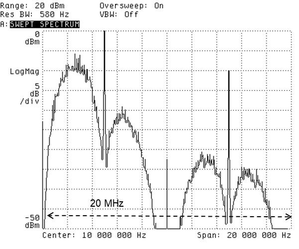 スペクトラム・アナライザの観測帯域をサンプリング・クロック(MCLK)周波数10 MHzの倍の20 MHzまで広げてみると(図4),ディジタル信号処理の教科書で見る,「5 MHzを中心とした対称の折り返し」になっていません.5 MHzを越えていくあたりからスペクトルのレベルが低下しています.ディジタル信号処理理論やここまでの数式による理論検討と少しの差異があることに気がつきます.