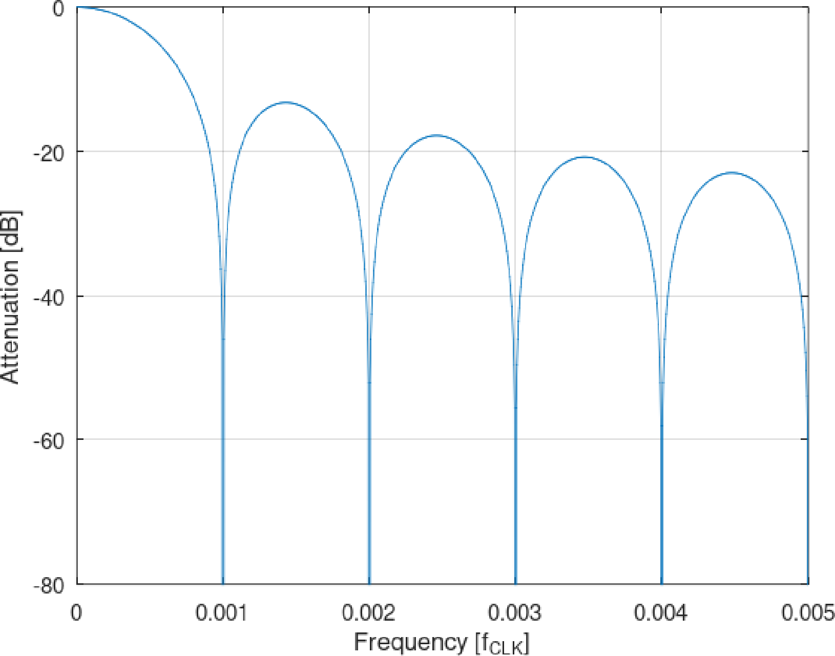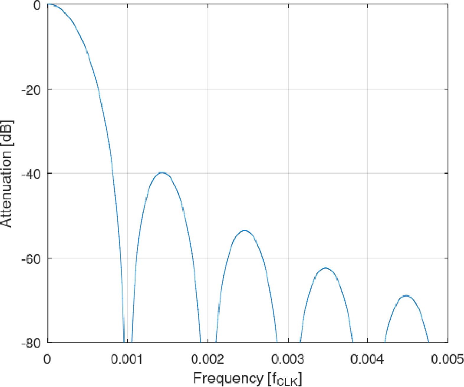 3段縦続に接続した$\mathrm{sinc}^3$フィルタの特性を図9に示します(縦軸は[dB]).