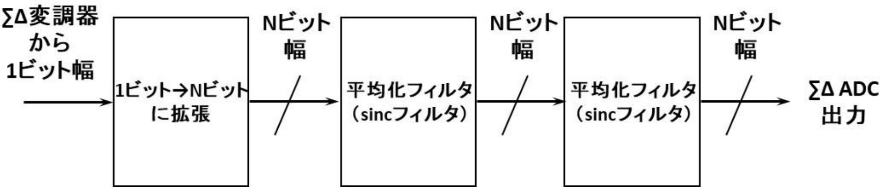 $\Sigma\Delta$型ADCのサンプリング周波数$f_{CLK}$(これまで動作クロックMCLKと示したもの)で出力される1ビット・データを$16ビット\times N$や$24ビット\times N$にビット拡張して($N$は$\Sigma\Delta$変調器の次数),平均化計算を行います(実際の計算方法はCICフィルタを使って簡略化されている.これが“$\times N$”の理由.稿末の[4]を参照).