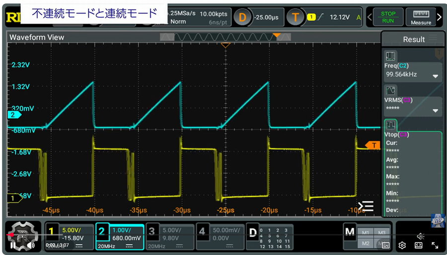 一方,DCMはスイッチング損失を抑えることができるため,低負荷時や軽負荷運転に適しています.しかし,負荷が増加すると電流のピークが抑えられ,最大出力に制限がかかる傾向があります.これはIC内部の電流制限機能や回路設計のボリューム設定によるものです.