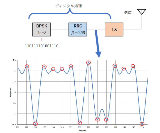 設計にあたってはシンボル・レートとサンプリング・レートの関係も考慮します.例えばシンボル・レートが16の場合,1シンボルあたり16サンプルが存在することになります.これにより時間軸上のフィルタ特性を細かく調整できます.