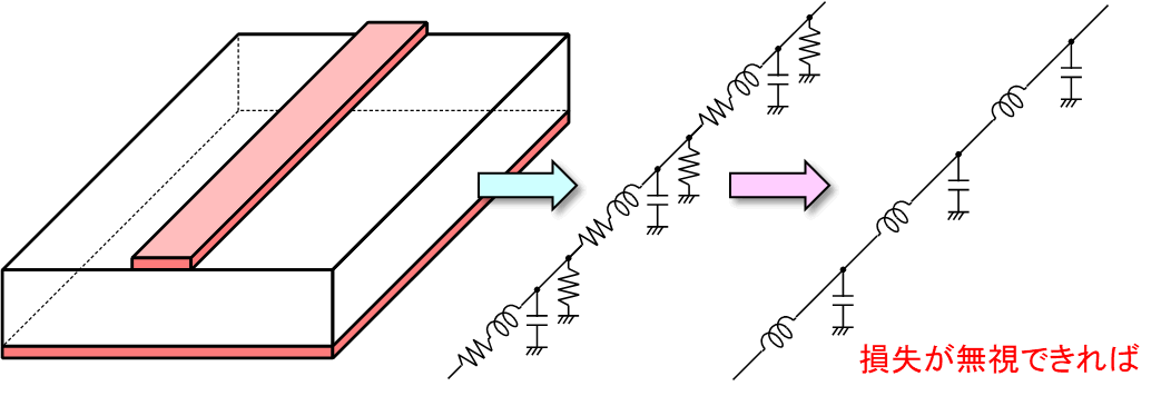 実際の伝送線路は,損失を無視できる微小区間が連続したものなので,等価回路は図3のように表せます.