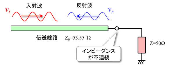 図7に示すように,特性インピーダンス53.55$\Omega$のプリント・パターンと50$\Omega$の回路と接続すると,インピーダンスが不連続になる接続点で反射が発生して,信号が信号源にもどっていきます.入力した電力の一部が入力側に戻されてしまうわけです.