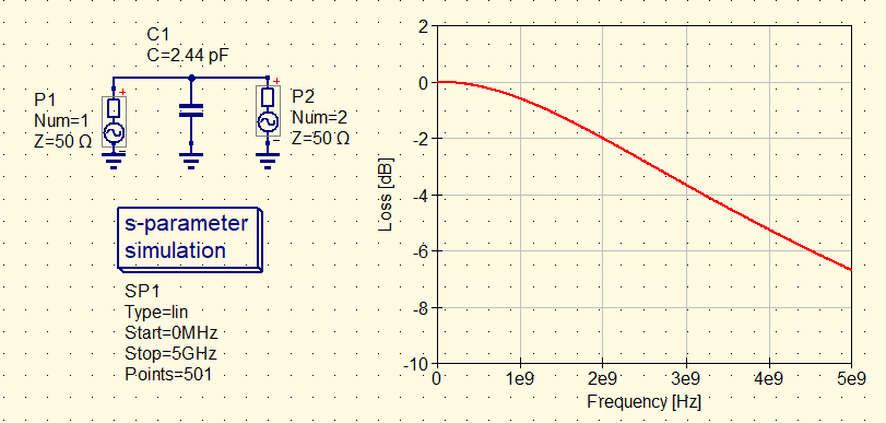 式\eqref{eq:characteristic_impedance2}から,$L_P$=7nHとして,特性インピーダンス$Z_0$が53.55$\Omega$になる,キャパシタンス$C_{P\alpha}$を求めると2.44pFです.
