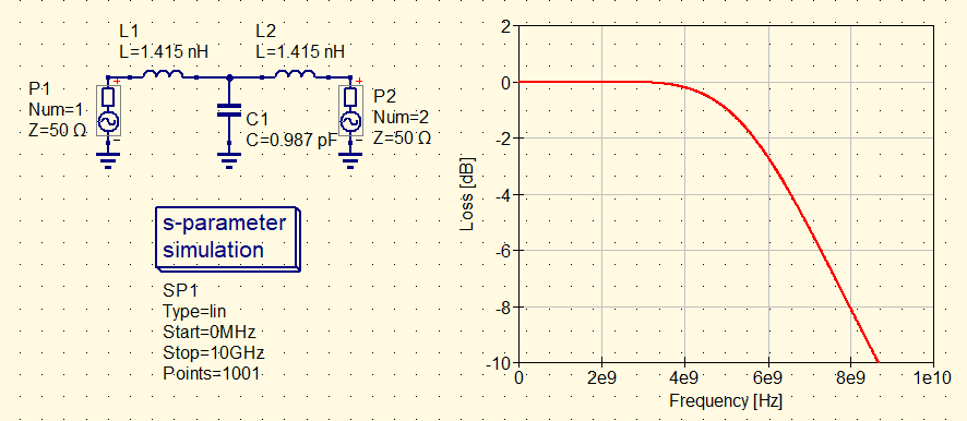 カットオフ周波数は約6.2GHzで,図6の10mmの場合よりも2倍以上高くなっています.先ほどと同様に,インダクタンス$L_P$を2つに分割して配置しています.