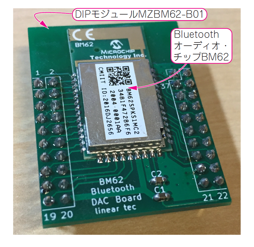 写真1 Bluetoothオーディオ・チップ“BM62”の評価用$2.54\mathrm{mm}$ピッチDIPモジュール “MZBM62-B01”(開発:リニア・テック,企画:ZEPエンジニアリング)