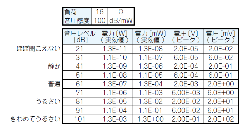 式(34)を利用してヘッドホンに印加する電圧と得られる音圧レベルの関係を計算すると,表1のようになります.ただし,「うるさい」や「普通」といった音量の表記はあくまで1つの目安だと考えてください.