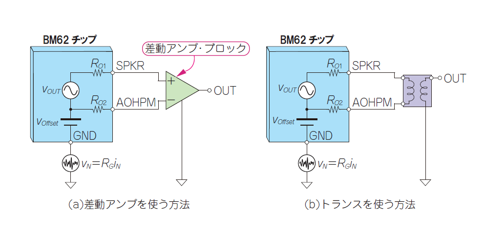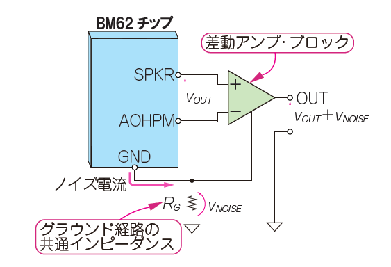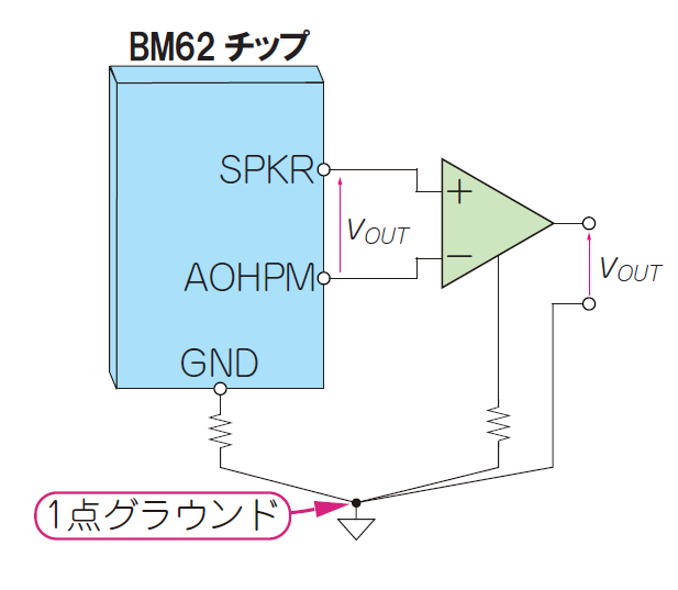 「キャップレス・モード」のように“SPKR”端子と“AOHPM”端子の間の電圧を差動アンプで取り出せば,BM62チップ自体の電位が揺れていてもコモン・モード・ノイズの影響を受けずに済みます.やや対処療法的ですが,「差動回路を使うことでノイズ耐性を向上させる」という考え方は一般的です.