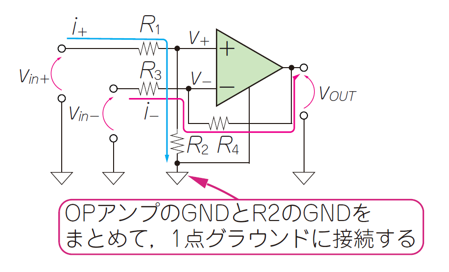 差動アンプを使った回路でも,グラウンド経路の配線には注意が必要です.
