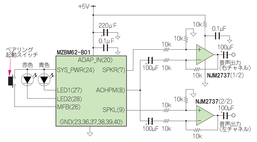 “MZBM62-B01”(写真1)は,Bluetoothオーディオ・チップ“BM62”(BM62SPKS1MC2)を搭載した$2.54\mathrm{mm}$ピッチのDIPモジュールです.BM62チップは,無線通信用の回路とオーディオ・コーデックを集積したディジ・アナ混載チップ SoC“IS2062”を内蔵しています.