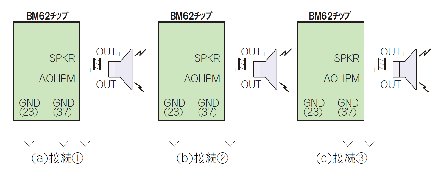 図4 ヘッドホンの基準($\mathrm{OUT}_-$)をBM62チップのグラウンドまたは,仮想グラウンド端子“ACHPM”にとるとノイズ音は出ない
