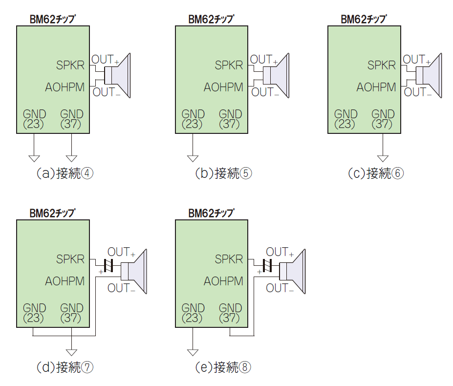 BM62チップとヘッドホンを図4のように接続したところ,ノイズは確認されませんでした.図4の(a),(b),(c)は「キャップレス・モード」でBM62とヘッドホンを接続しています.これに対して,図4の(d),(e)は「シングルエンド・モード」で接続しています.