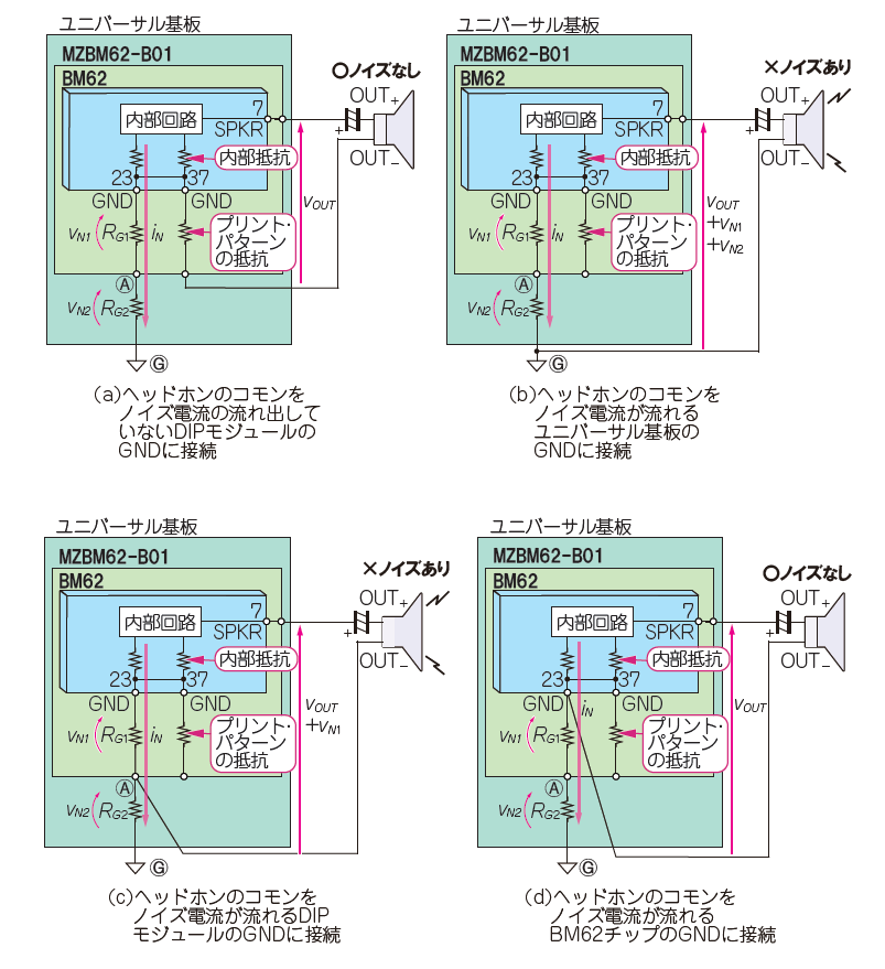 図5(d)は,グラウンド経路のインピーダンスをできる限り小さくした場合のノイズを確認するための実験です.このとき,ヘッドホンからはノイズが聞こえませんでした.これが,BM62チップの本来の実力ということになります.