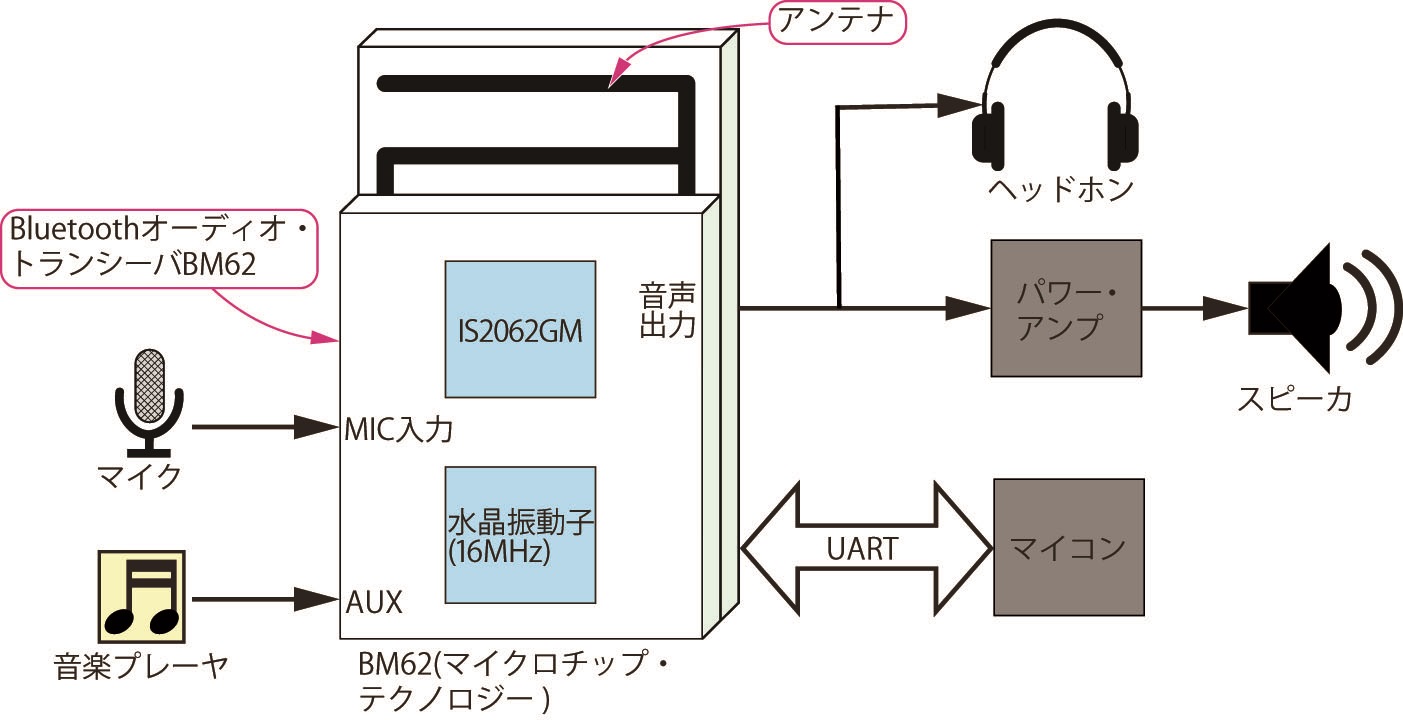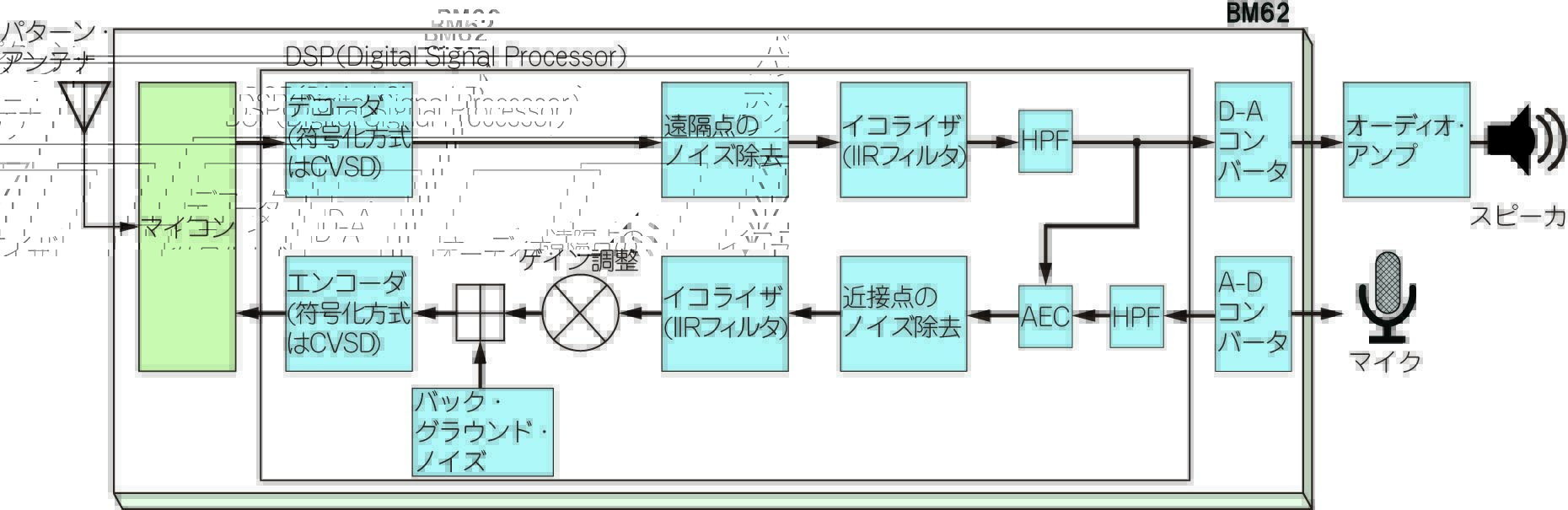 BM62には,Bluetooth通信のためのRF(Radio Frequency)回路と音声処理用のDSP(Digital Signal Processor)を一体化した“IS2062”というSoC(System On Chip)が使われています.図2にこのシステムの全体図を示します.