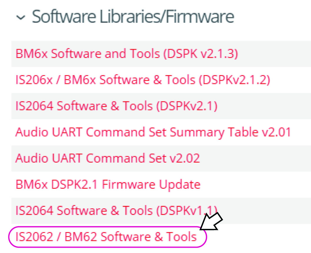 https://www.microchip.com/wwwproducts/en/BM62 - “Documents”の項目の“Software Libraries/Firmware”欄の“IS2062/BM62 Software & Tools”をダウンロードする(図10)