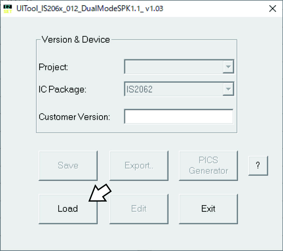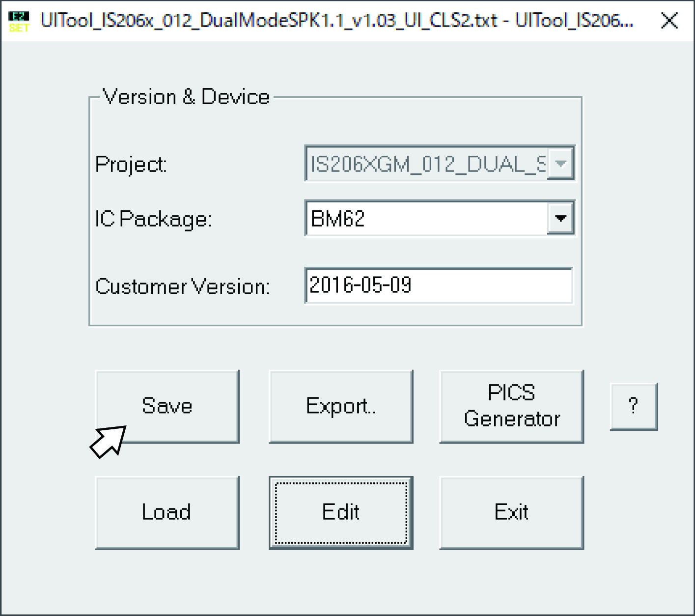 - “UI Tool”ディレクトリ内の“UITool_IS206x_012_DualModeSPK1.1_v1.03.exe”を起動する