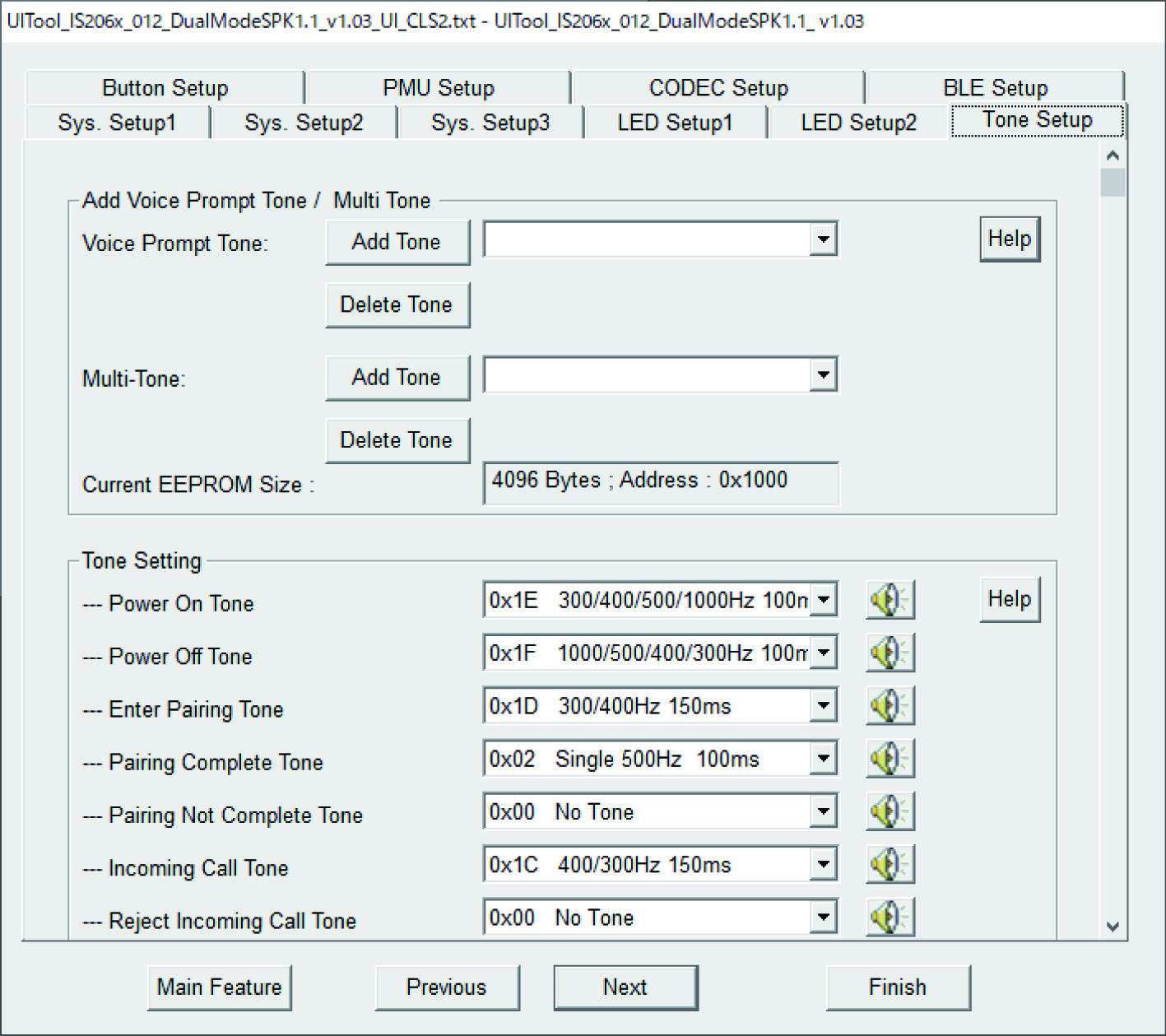 ・DSP Tool:内蔵DSPの設定変更に使うツール(今回は使わない) ・EEPROM Tool:内蔵EEPROMの書き込みツール ・MPET Tool:書き込み用ファイル(ipfファイル)を生成するためのツール ・UI Tool:ボタンや操作音などの設定をするためのツール