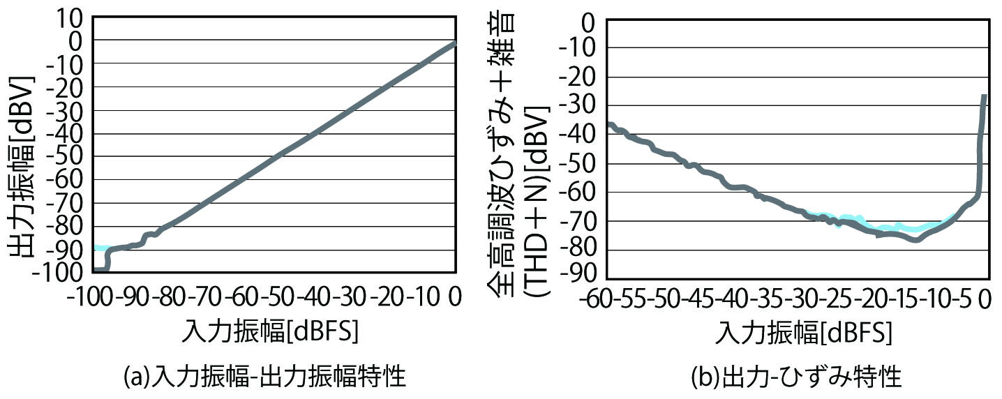 図4(a)に入力振幅-出力振幅特性を,図4(b)に全高調波ひずみ率(THD+N,Total Harmonic Distortion+Noise)特性を示します.$16\mathrm{Ω}$負荷,$1\mathrm{kHz}$,$-1\mathrm{dBFS}$入力時のひずみ率(THD+N)は$0.05\%$です(データシートより).