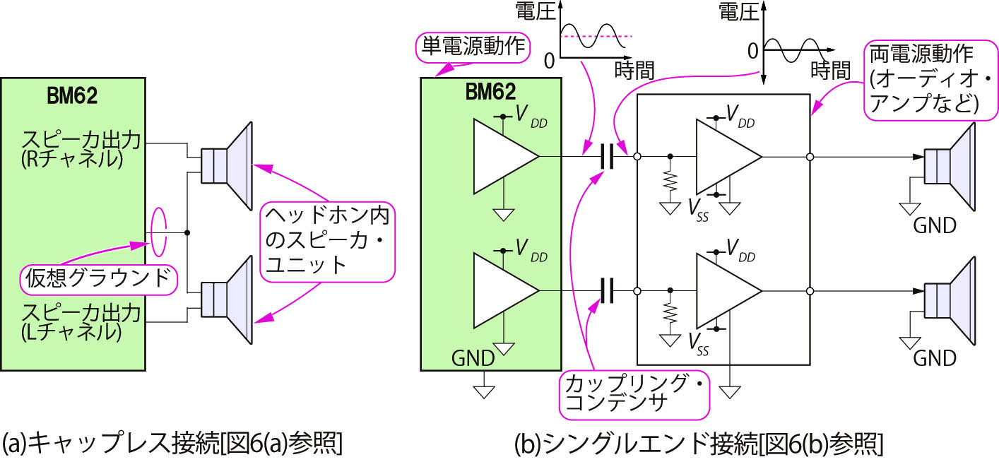 DCカット用のキャパシタを使う必要がないので,実装スペースとコストの節約になります.また,この接続方式はBM62全体の電位が揺れるようなコモン・モード・ノイズに強いという特徴もあります.