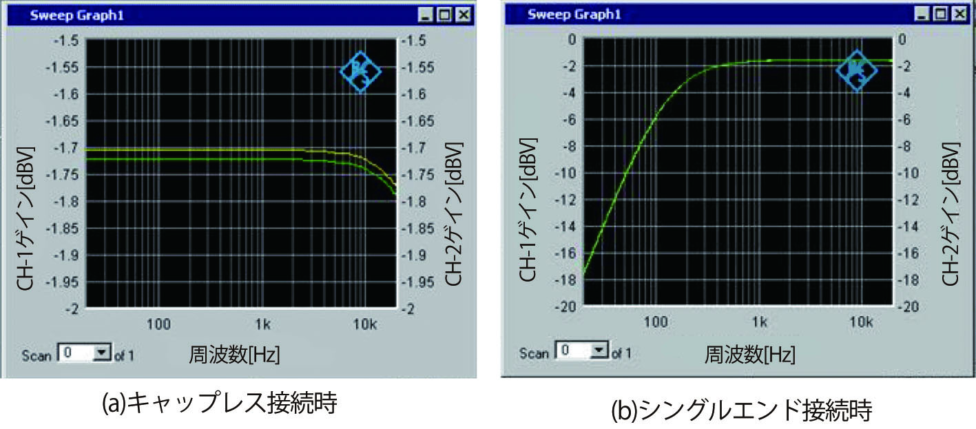 図6(b)に,シングルエンド・モード接続時の周波数特性を示します.シングルエンド・モードではDCカット用のキャパシタを使用するので,低域側の信号が減衰しています.とはいえ,小型のヘッドホンやスピーカの最低共振周波数は$100\mathrm{Hz}$程度なので,低域の減衰を極端に気にする必要はないと考えられます.