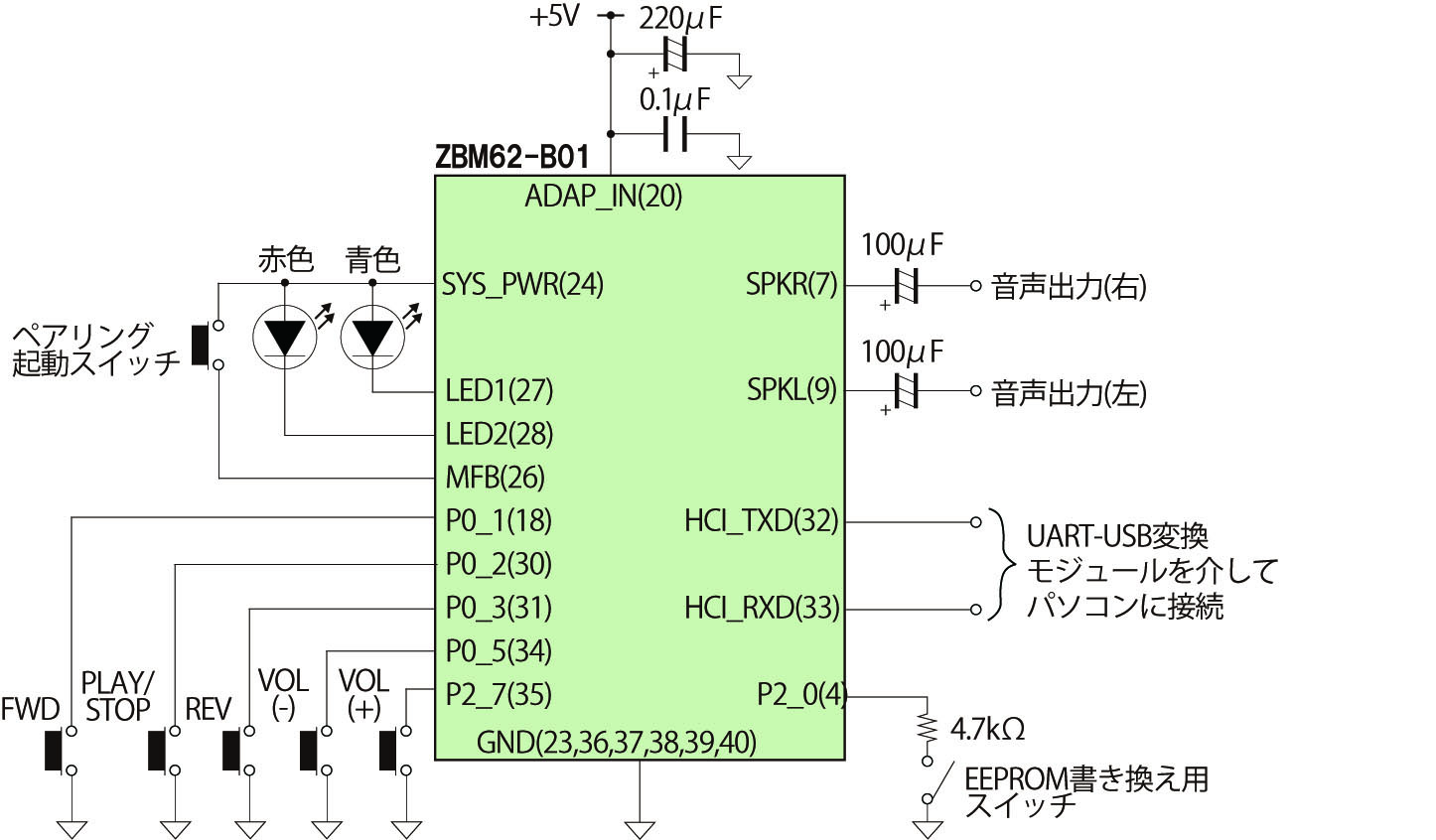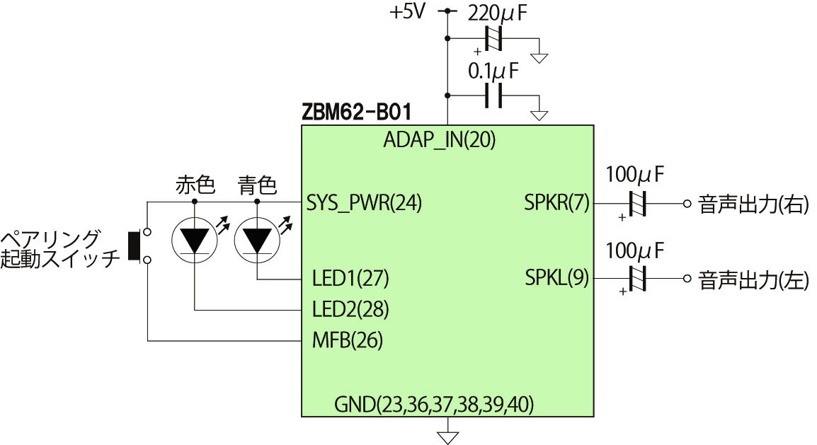 電源用のパスコン,音声出力のDCカット用のキャパシタ,電源ON/OFFおよび機器のペアリング時に使うプッシュ・スイッチ,動作確認用のLEDで構成されています.6本のグラウンド端子を接続するグラウンドの配線は,十分に低インピーダンスになるようにしてください(ベタ・グラウンドが理想).