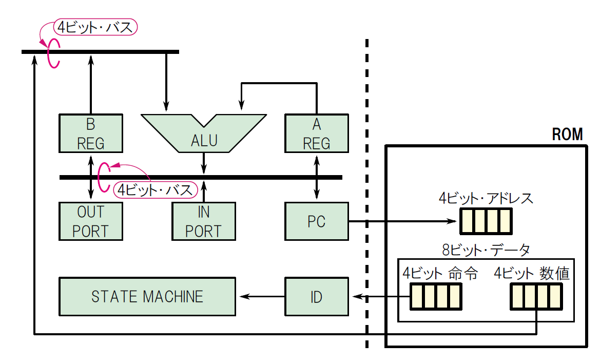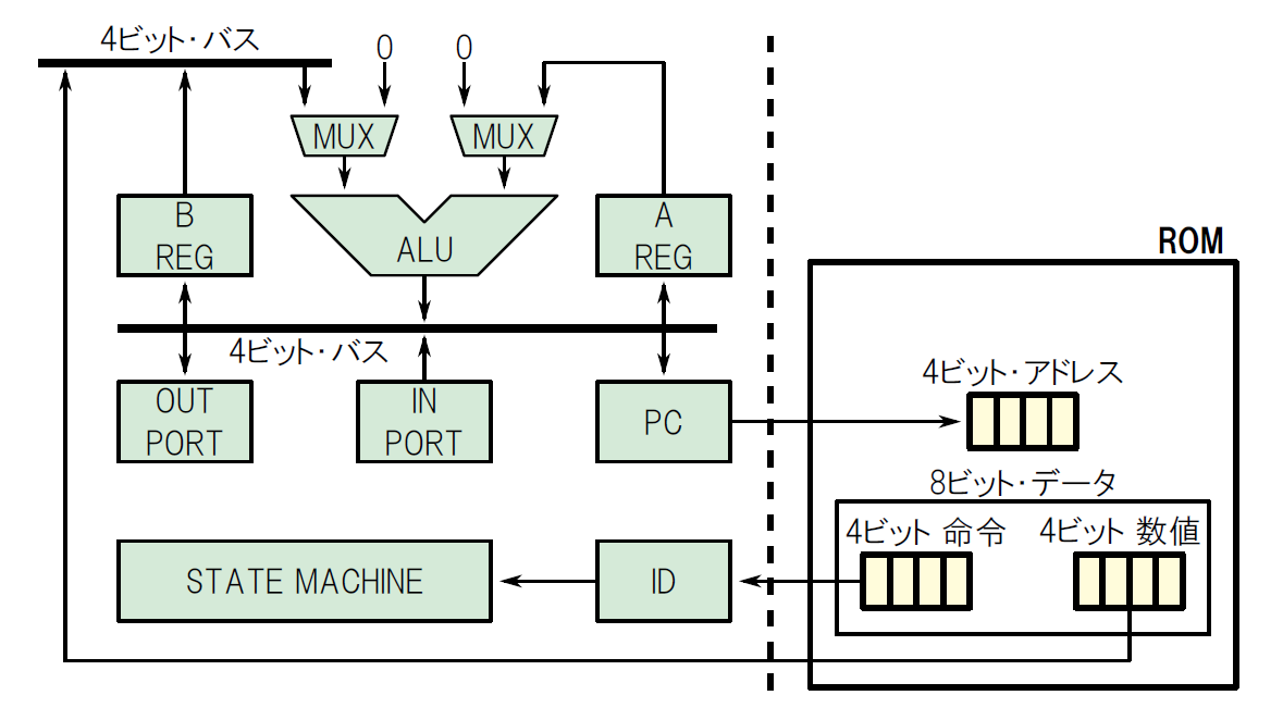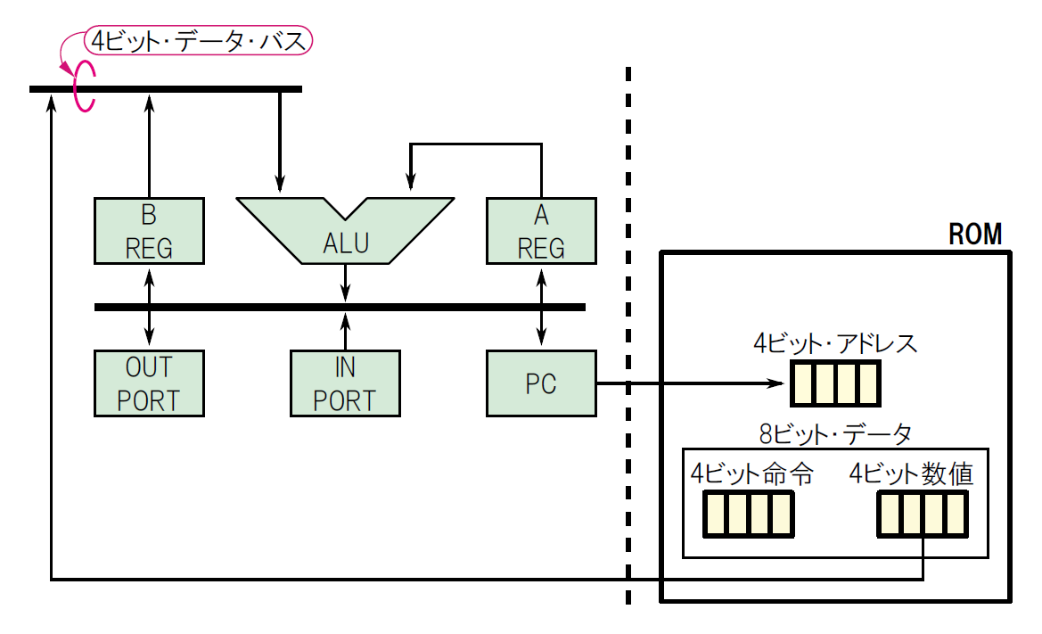 これから設計するCPUの「命令」(instruction)は,すべて4ビット幅とします.このコンピュータのユーザはCPUの命令を実行したい順番に並べてROMに保存し,「プログラム」を作ります.また,CPUが処理する「数値データ」も,命令と一緒にROMに保存しておきます.この数値データは,演算に使う数値やジャンプ先のアドレスなどが該当します.この数値データも4ビット幅とします.
